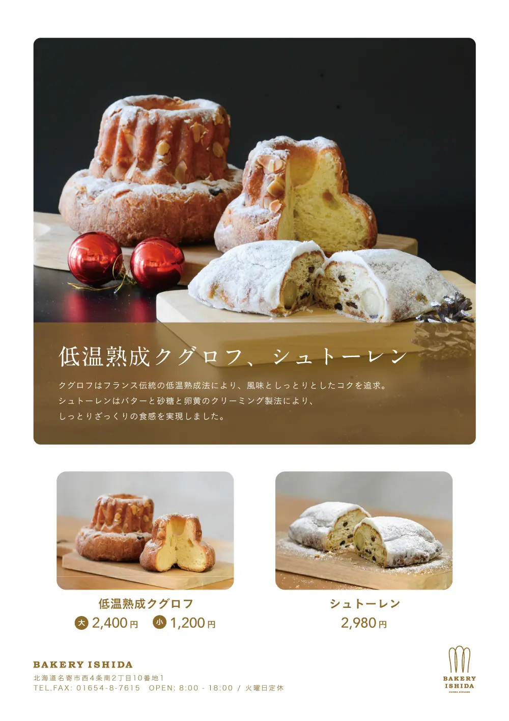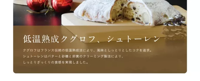 今年も低温熟成クグロフとシュトーレンを販売いたします。 予約受付:2025年12月3日(水)~12月21日(日) 低温熟成クグロフ:大2,400円、小1,200円 シュトーレン:2,980円 詳細は01654-8-7615までお問い合わせください。