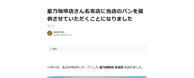 当店のパンを星乃珈琲店さんの名寄店に提供させていただけることになりまして、その経緯などをnoteにまとめてみました。 どうぞご覧ください。フォローやいいねなどいただけると幸いです。 note(BAKERY ISHIDA)